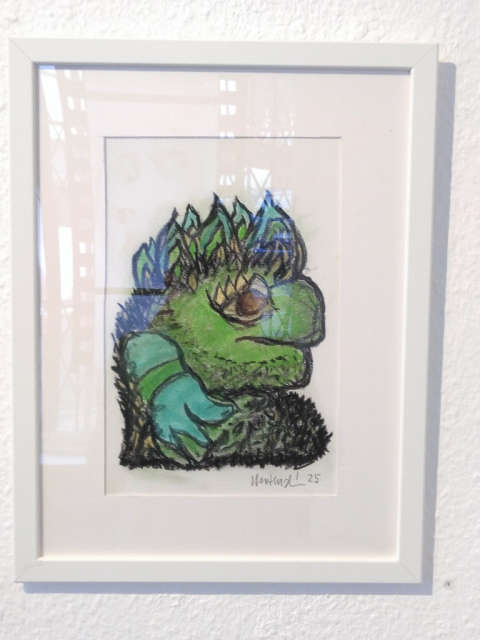 "In von Landschaft oder Figur, die sie dann staunend den gar nicht so seltenen Fällen, in denen fremde Materialien auftauchen, eingebunden, eincollagiert, eingemalt, oft auch als Frottage, scheint auf, was sie in ihren autonomen Formulierungen eben auch immerzu herzustellen versucht: der Punkt, an dem ihre bildnerische Intelligenz oder Erfahrung einen Anlass (er) findet, auf den sie antwortet, den sie phantasivoll ausdeutet, umdeutet, weitererzählt, kommentiert, da ist oft Leichtigkeit, Schalk, Humor. Und ein wacher Geist, der sich und die auftauchenden Gelegenheiten beobachtet, um was herzustellen?