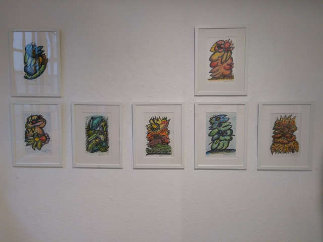 Die Techniken sind in den Malereien Acryl auf Papier, die Zeichnungen jeweils Tusche auf Papier, die Radierungen sind als Zuckeraquatinta gearbeitet.